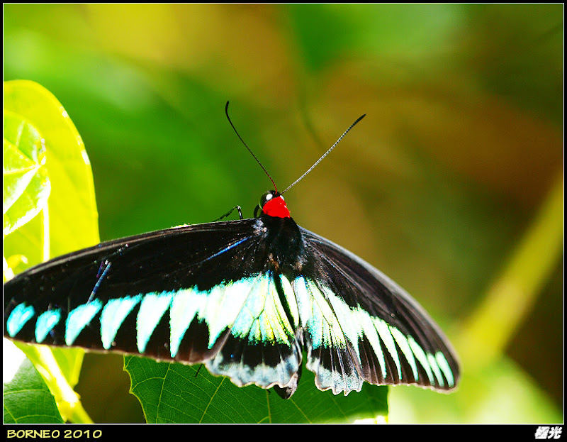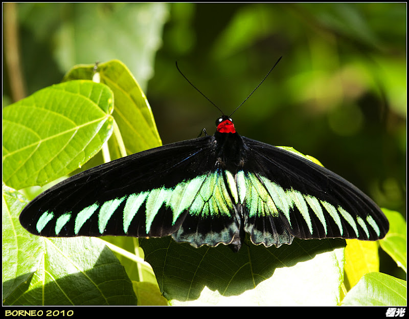 聽其名,不難知道牠展翅如鳥翼一般,這可是婆羅洲非常有名的特有品種─翠葉紅頸鳳蝶,又名布氏鳥翼蝶。