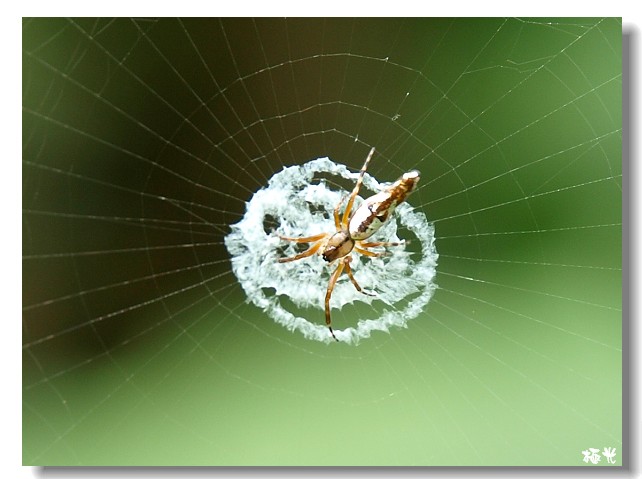 這隻身長不到一公分的銀白色蜘蛛,在圓形的蜘蛛網中結了漩渦般的白色隱帶,